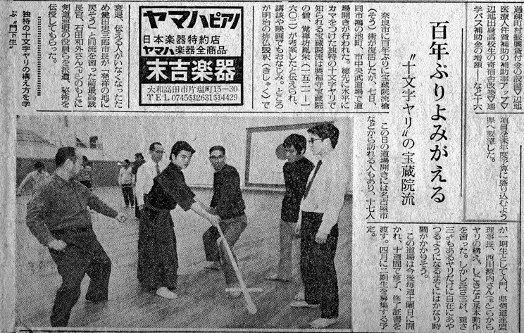 「宝蔵院流槍術、再興」夕刊フジ 掲載 (S51(1976).3.12) 奈良市民だより「宝蔵院流槍術 奈良へ帰る」掲載 (S51(1976).7.15) NHKテレビ「近畿の話題 奈良」よみがえった宝蔵院流の槍 (S52(1977).1.23) 発祥の奈良の地に蘇えった宝蔵院流十文字鎌槍のいきさつ (S53(1978).7) 宝蔵院流槍術 奈良への里帰り (H21(2009).9) 石田和外先生 ご愛用稽古槍 受贈 (H21(2009).11.25) 宝蔵院流高田派槍術 第十八世宗家 石田和外先生ご愛用稽古槍の受贈 (H22(2010).5) |